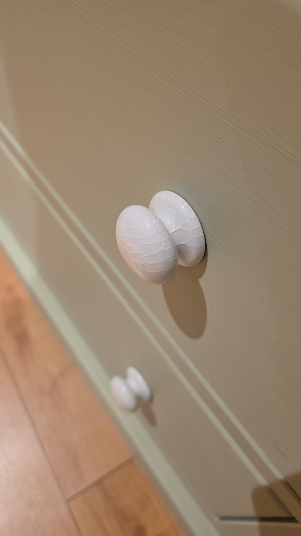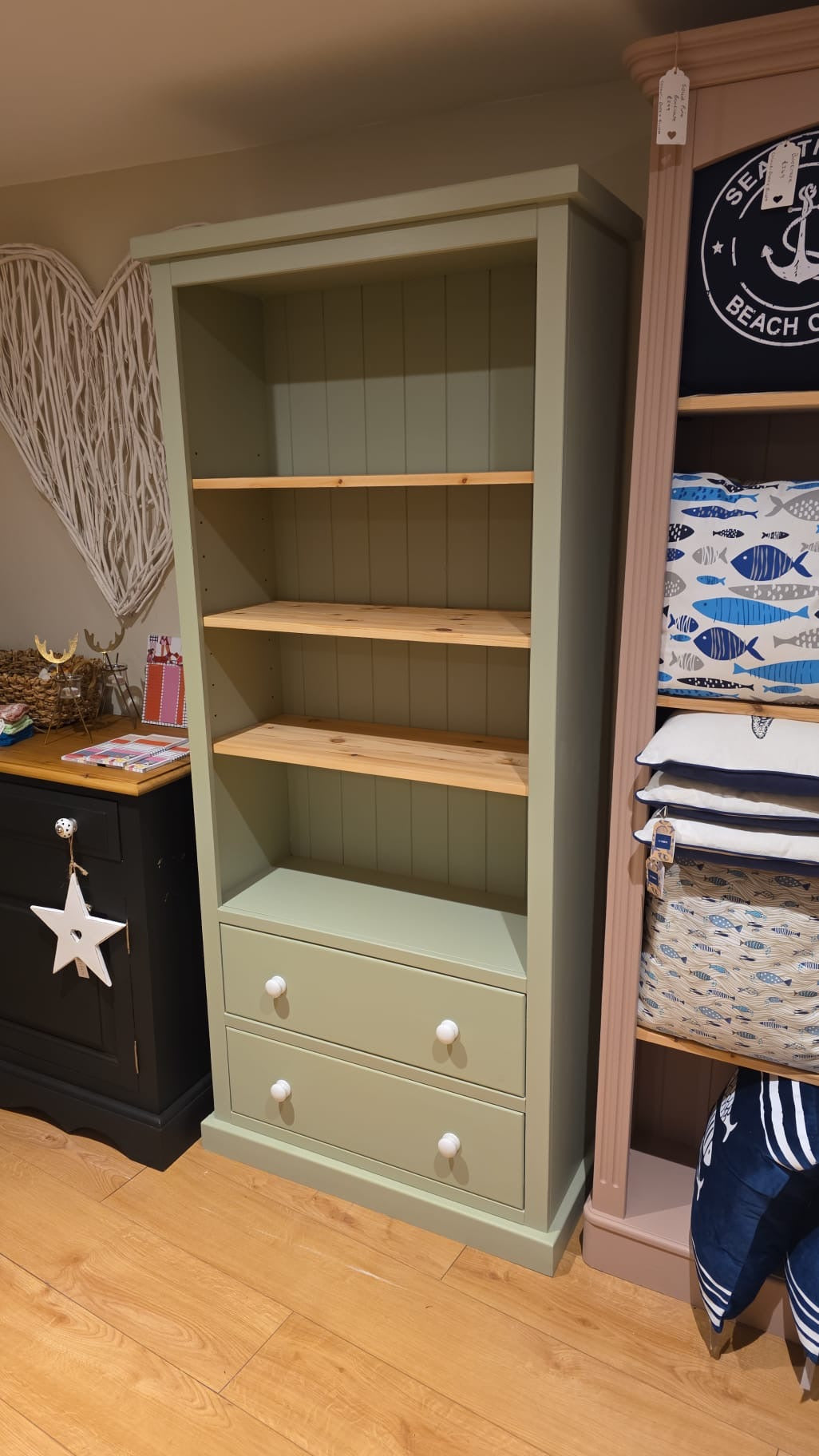 Beautiful Solid Pine Bookcase. Really Different piece of furniture with 2 large drawers at the bottom. Makes a really handy storage piece. Very Chunky bookcase with adjustable shelves. Hand painted in Frenchic Wise Old Sage. The shelves have been sanded back to the natural wood which gives a lovely contrast against the green. I have added white crackle ceramic knobs which finish it beautifully.