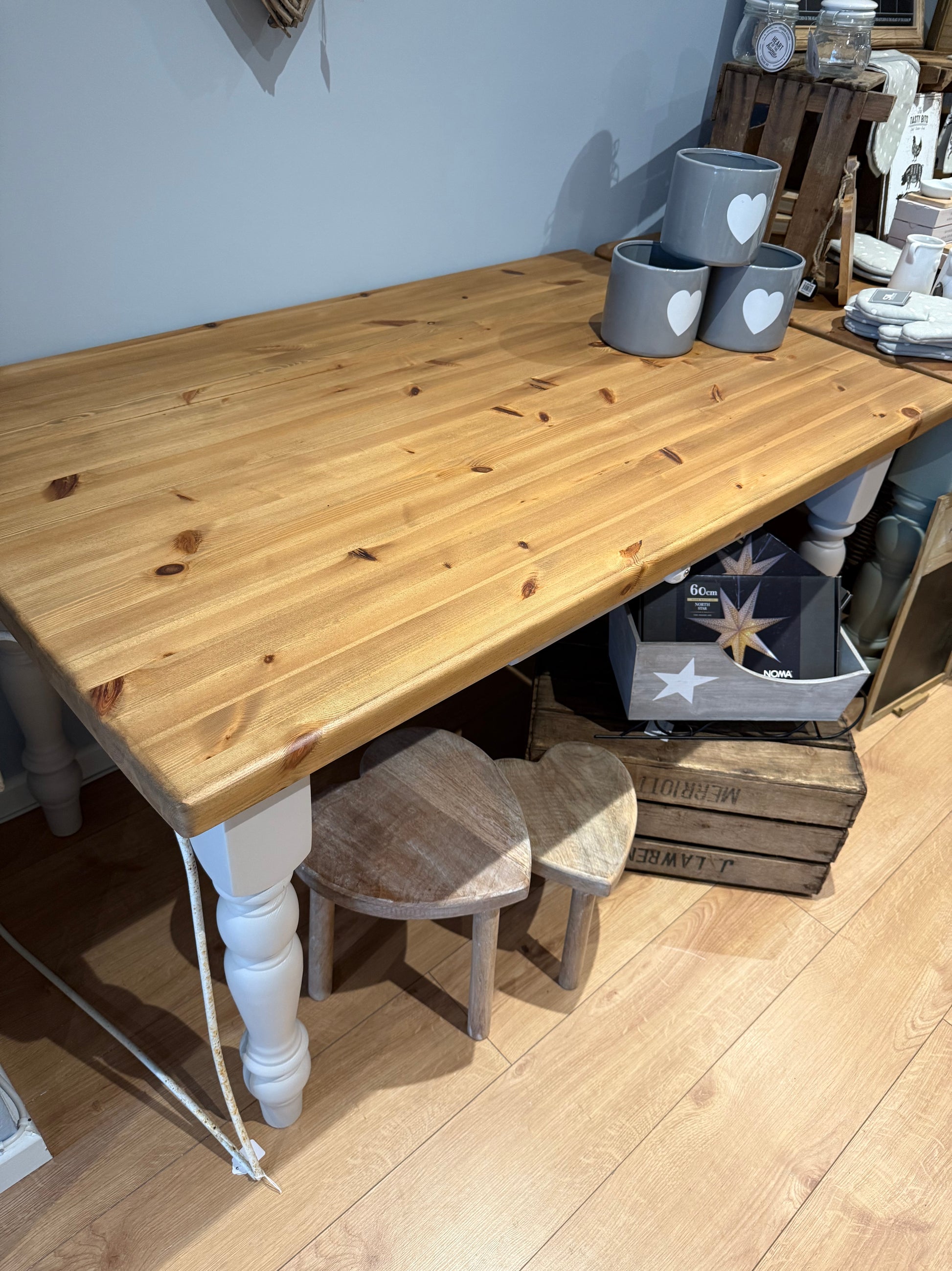 Beautiful Solid Pine Chunky Dining Table. Hand Painted in Frenchic Cool Beans. The Top of Table has been sanded back and waxed in Browning wax. Cute little cutlery drawer with heart ceramic knob which finishes it beautifully.