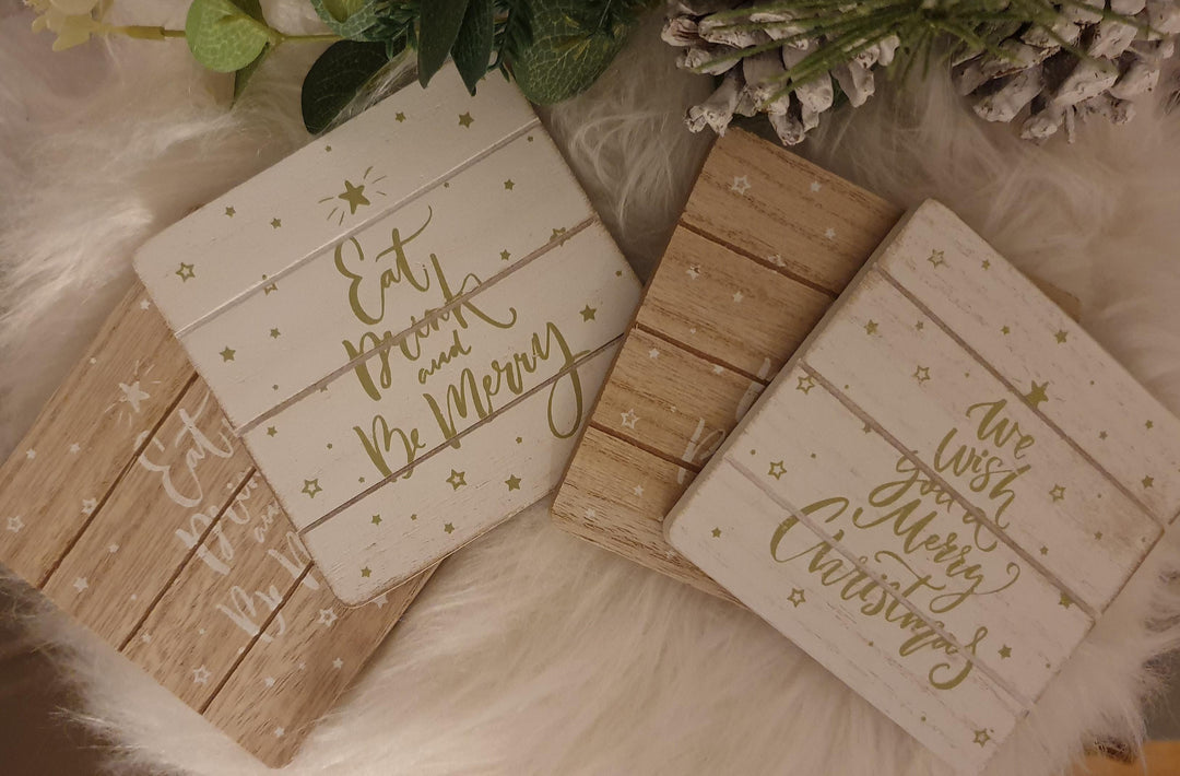 A distressed set of 4 wooden coasters with little 3d houses and Christmas tree adorning the holder, with rustic tongue and groove effect and green, natural and white colours on the coasters, these will fit with any decor. Four coasters green, white and natural with white or green script or picture.
